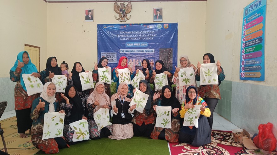 Sesi kedua, yaitu Pembuatan Ecoprint pada Tote Bag, memperkenalkan teknik cetak alami (ecoprint) menggunakan daun dan bunga yang ada di lingkungan sekitar. Melalui pelatihan ini, para ibu PKK diajak untuk mengolah bahan alam menjadi motif cantik pada tote bag, sekaligus mengasah kreativitas dan menumbuhkan kepedulian terhadap lingkungan. Tote bag hasil karya tidak hanya bernilai estetika, tetapi juga dapat digunakan sehari-hari sebagai pengganti kantong plastik kresek.